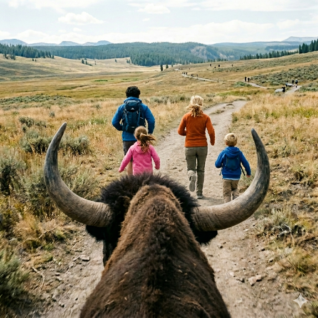 The footage, taken from a forward-facing bison-mounted camera, shows a group of tourists slowly approaching for photos before immediately transitioning into what officials are calling a “high-speed educational retreat.”