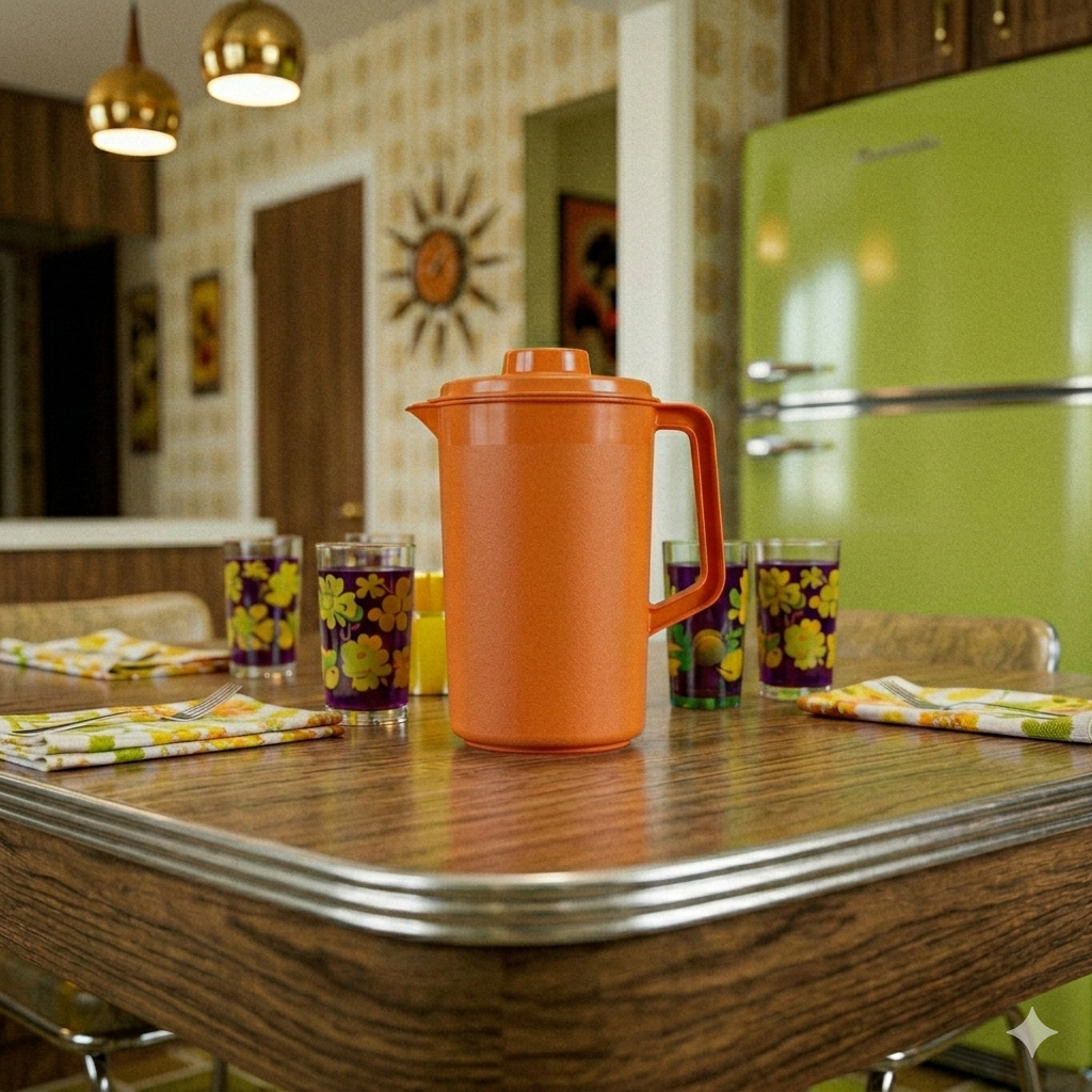 Okay, fellow 70s and 80s survivors, this one is for you. Looking at this vintage photo of a perfect kitchen setting, I had a sudden flashback. Who knows exactly what was kept in this iconic harvest orange pitcher, sitting on that classic table? If you saw this pitcher, you already know the potential answers. 🧡